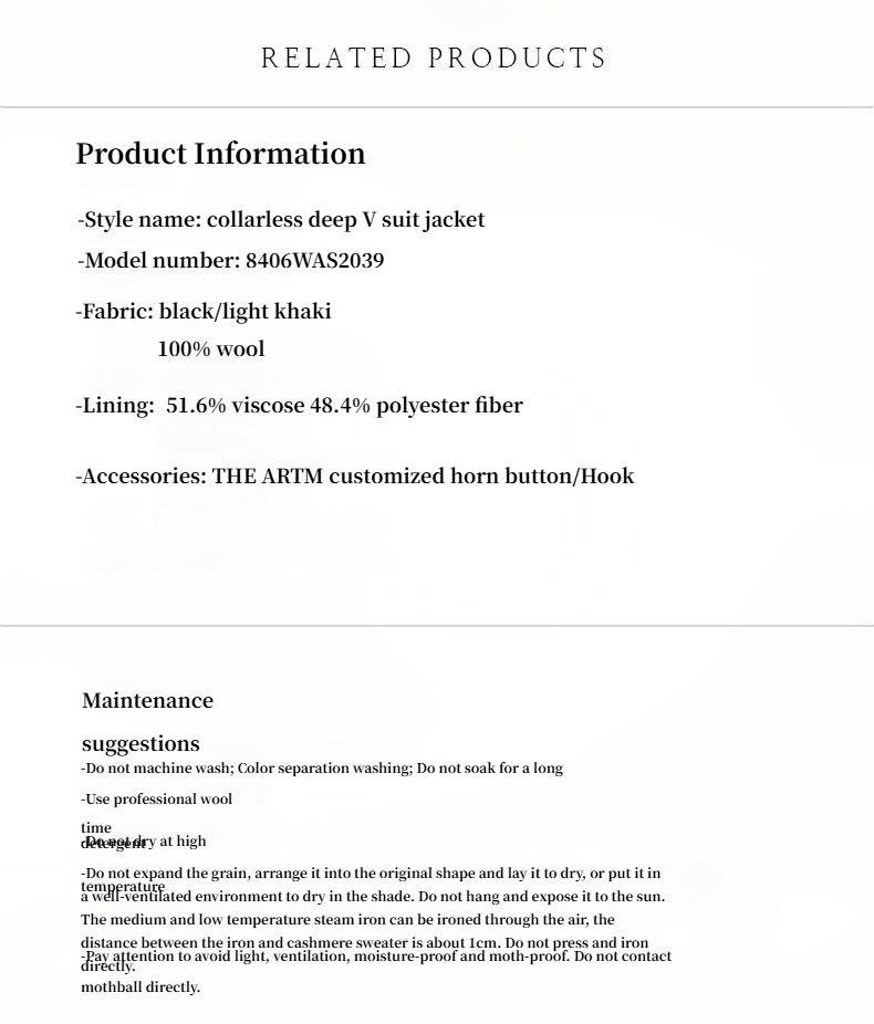 A timeless and minimalist H-line blazer, expertly tailored to create a sleek, flattering silhouette. The collarless design and slimming deep V-neckline showcase a graceful neckline, radiating sophistication and understated elegance. Straight-cut sleeves gently elongate the arms, while custom horn buttons add a subtle yet distinctive touch, elevating the overall style.