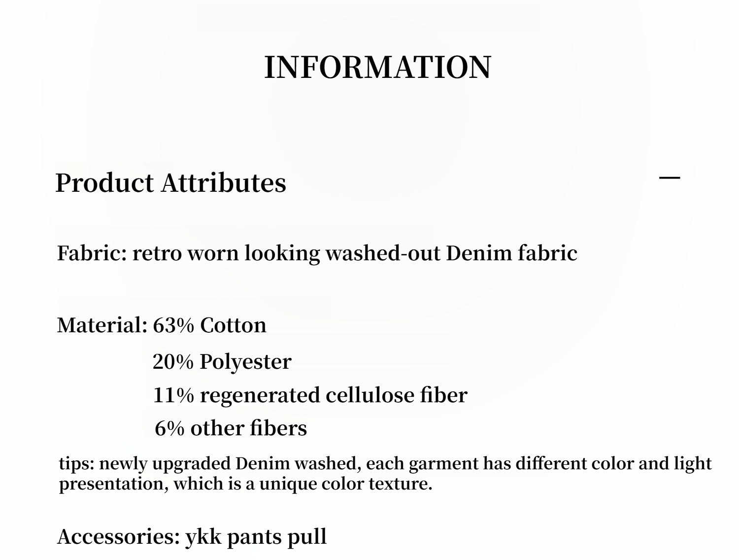 High proportion of cotton denim, with special bamboo texture, richer texture than ordinary denim, sufficient elasticity and good shape retention, strong and wide bone feeling, not easy to deform and bulge, durable and easy to care for.