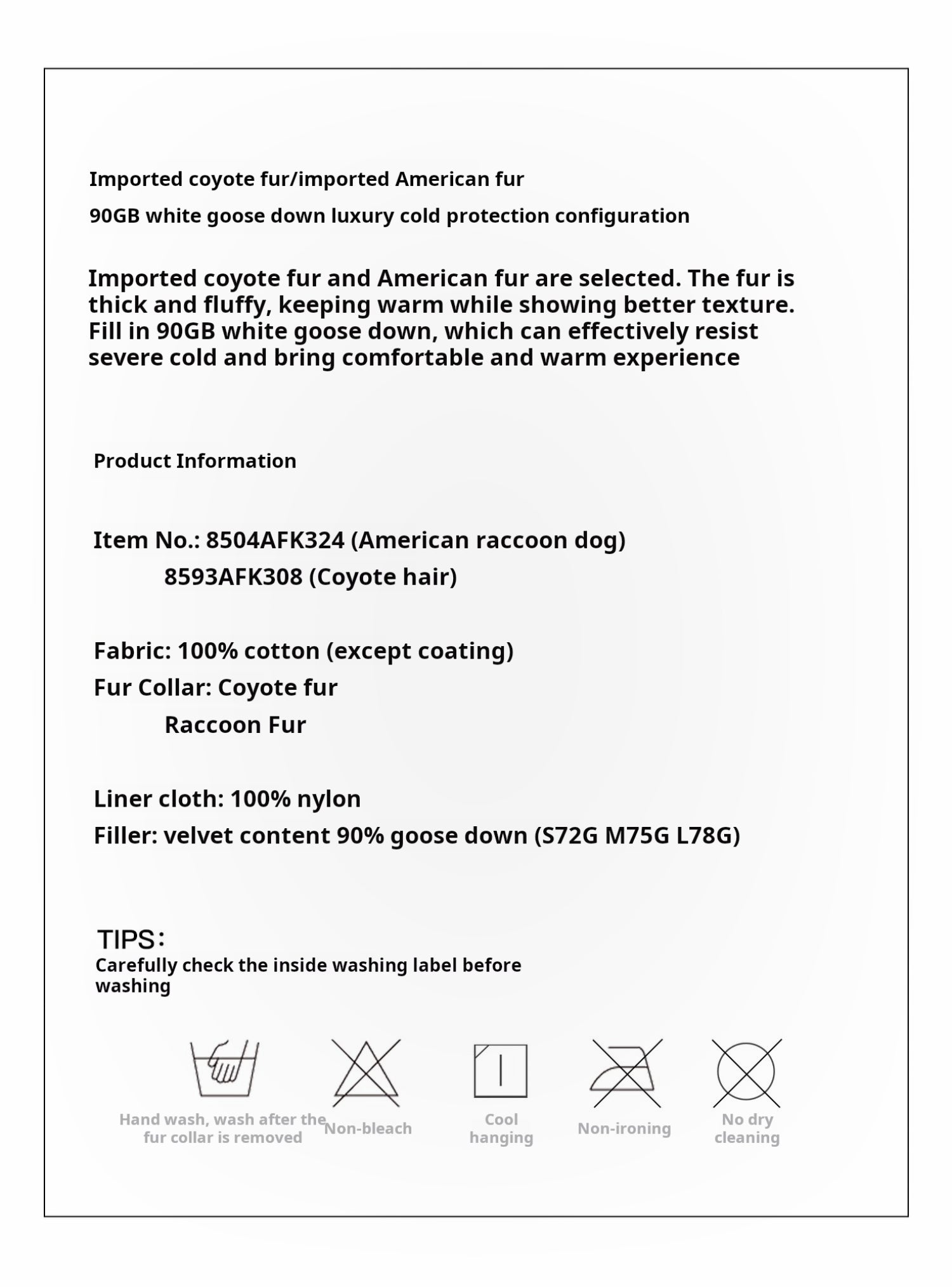Choose Your Luxury Fur: Select between imported coyote fur or American raccoon fur for your detachable collar. Both options are dense and fluffy, offering exceptional warmth and refined texture. The collar can be styled up or laid flat for different looks - elegant and cozy either way.