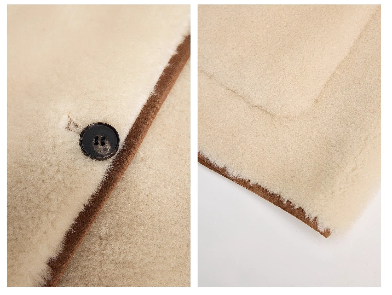 The fine and even sheep-sheared velvet surface is dense and warm, and the fine velvet-feel artificial compound suede lining is retro and fashionable. The contrast-colored edged wool lapels are neat and stylish, modifying the neck, making it warm and comfortable, simple and fashionable.