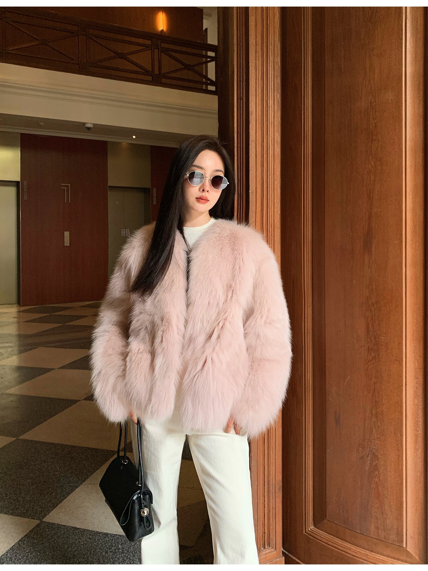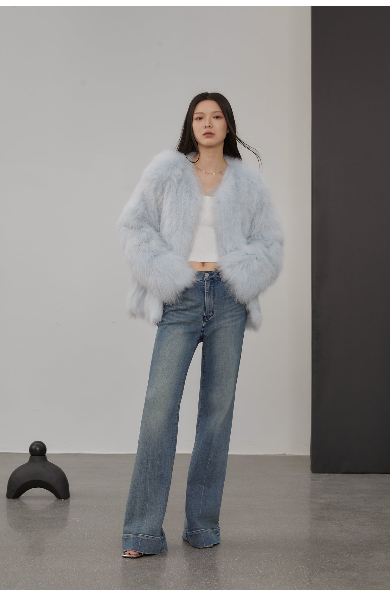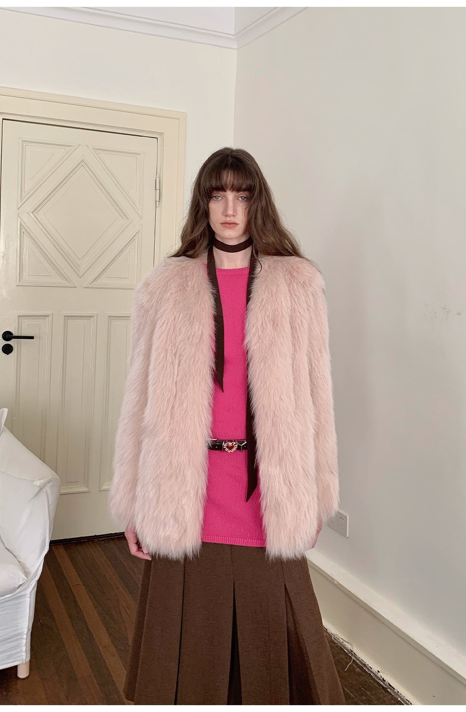 The luxuriously loose and comfortable fit of the Black Sugar Champagne Finland saga fox fur coat fashion cardigan provides a flattering silhouette, concealing excess weight and accentuating a slender figure. The V-neckline has been carefully perfected for a seamless, overlapping closure. This versatile piece can be effortlessly combined with other pieces for a playful and stylish look, while the draping adds an elegant touch. Embrace fashion and comfort with this essential outerwear, perfect for any occasion.