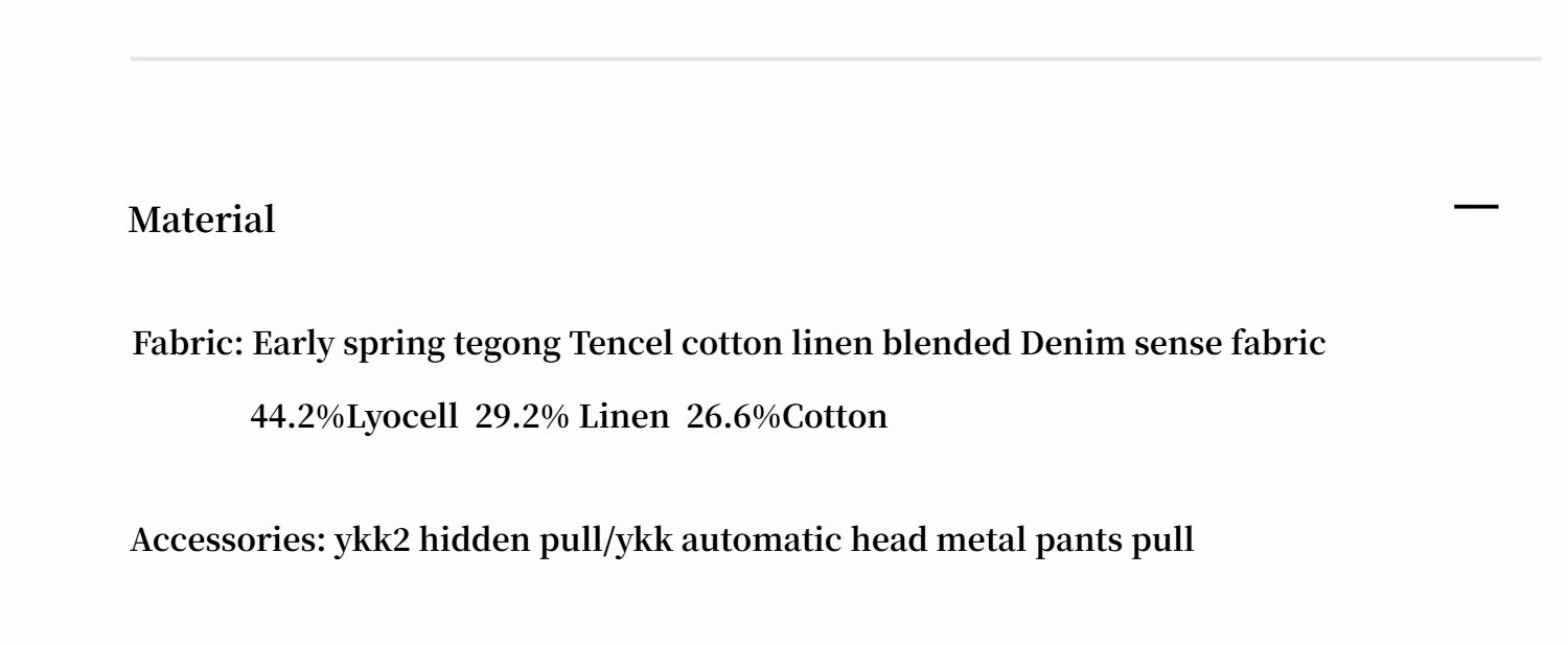Exclusively customized Tencel cotton and linen blended fabric, made from a blend of Tencel and cotton and linen. If you look closely, the surface has a natural luster, which can't hide the sense of high fashion. The blended fabric is quite difficult to make and has a strong texture.