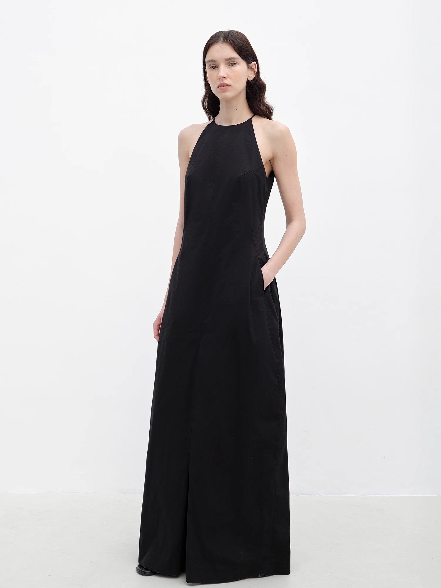 - Halter-inspired neckline with thin straps for a modern, flattering touch