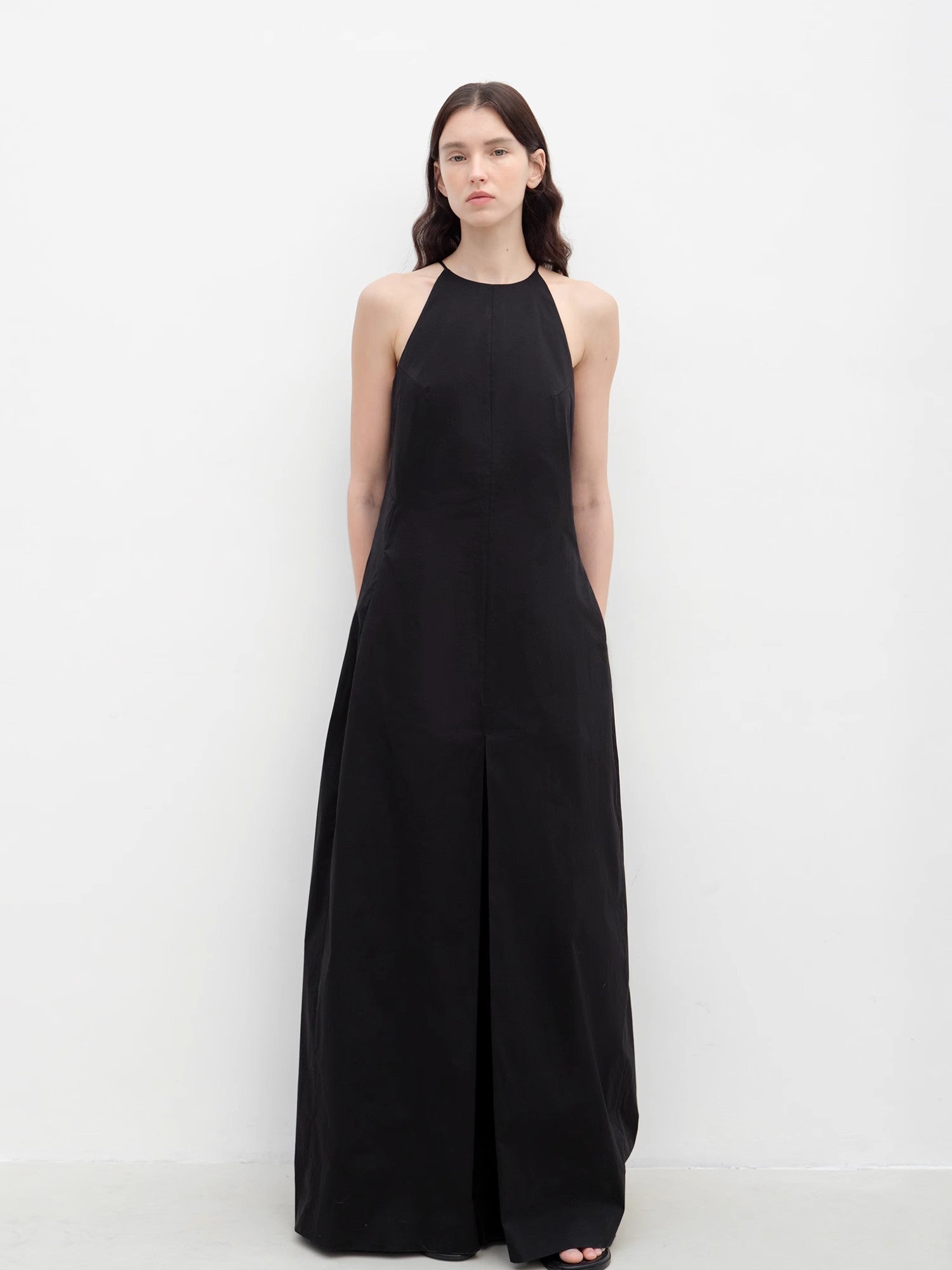 A graceful fusion of structure and softness, this halter-inspired cocoon dress embodies modern elegance with effortless wearability. Delicate thin straps form a halter-neck illusion at the round neckline, beautifully framing the shoulders and collarbone. The softly cinched waist and front center pleats create a gentle drape that flatters the figure while enhancing fluid movement.