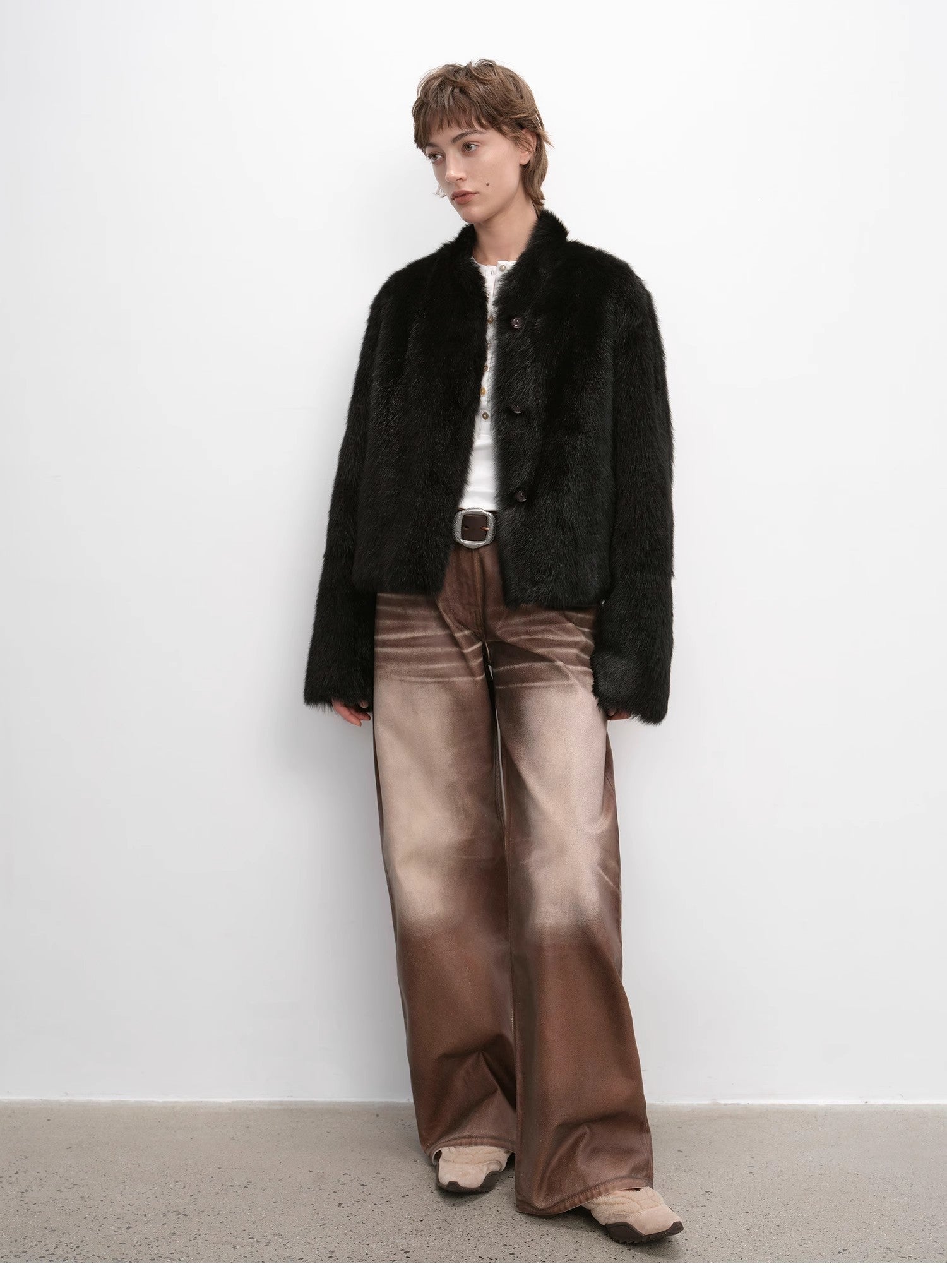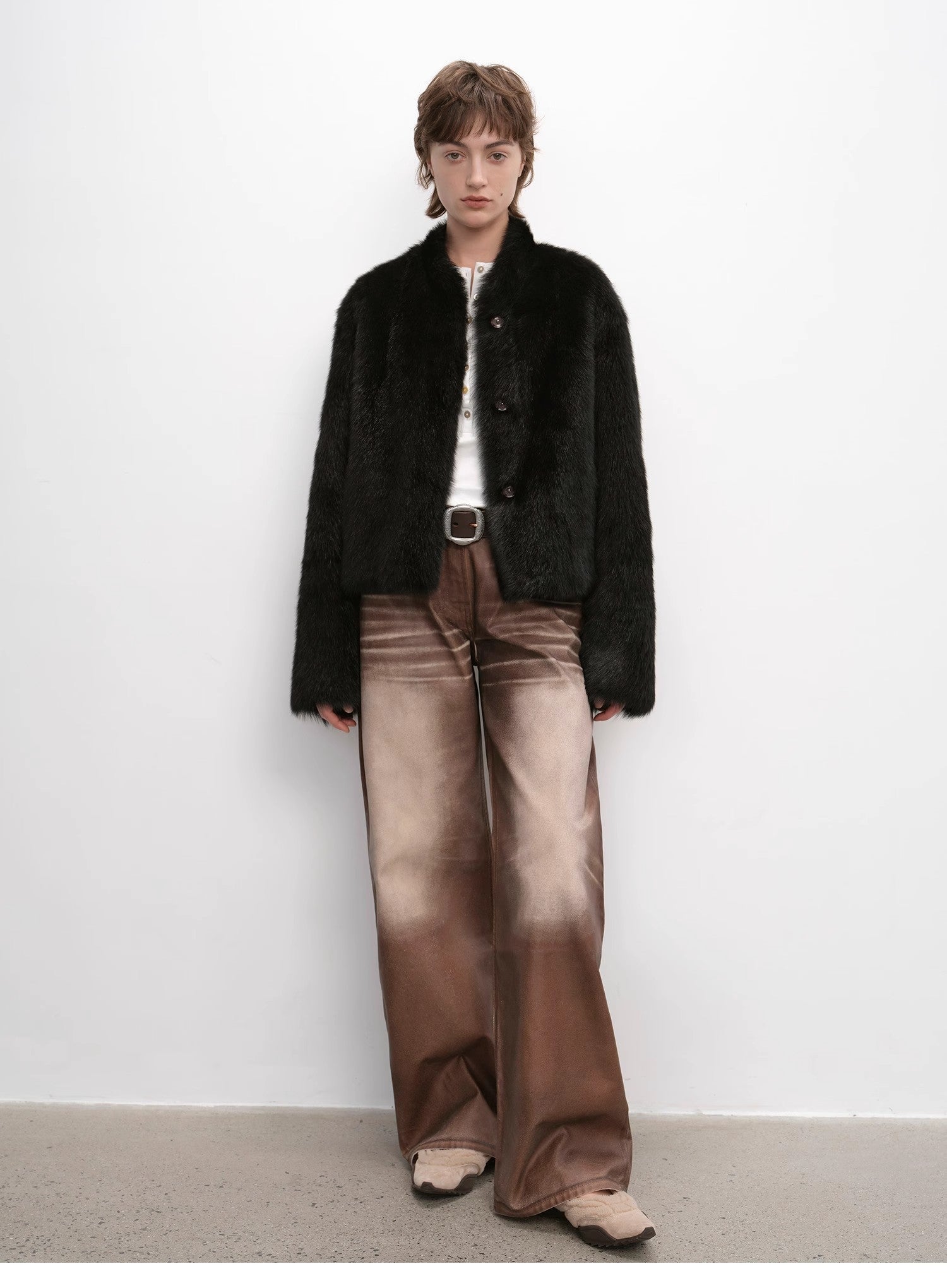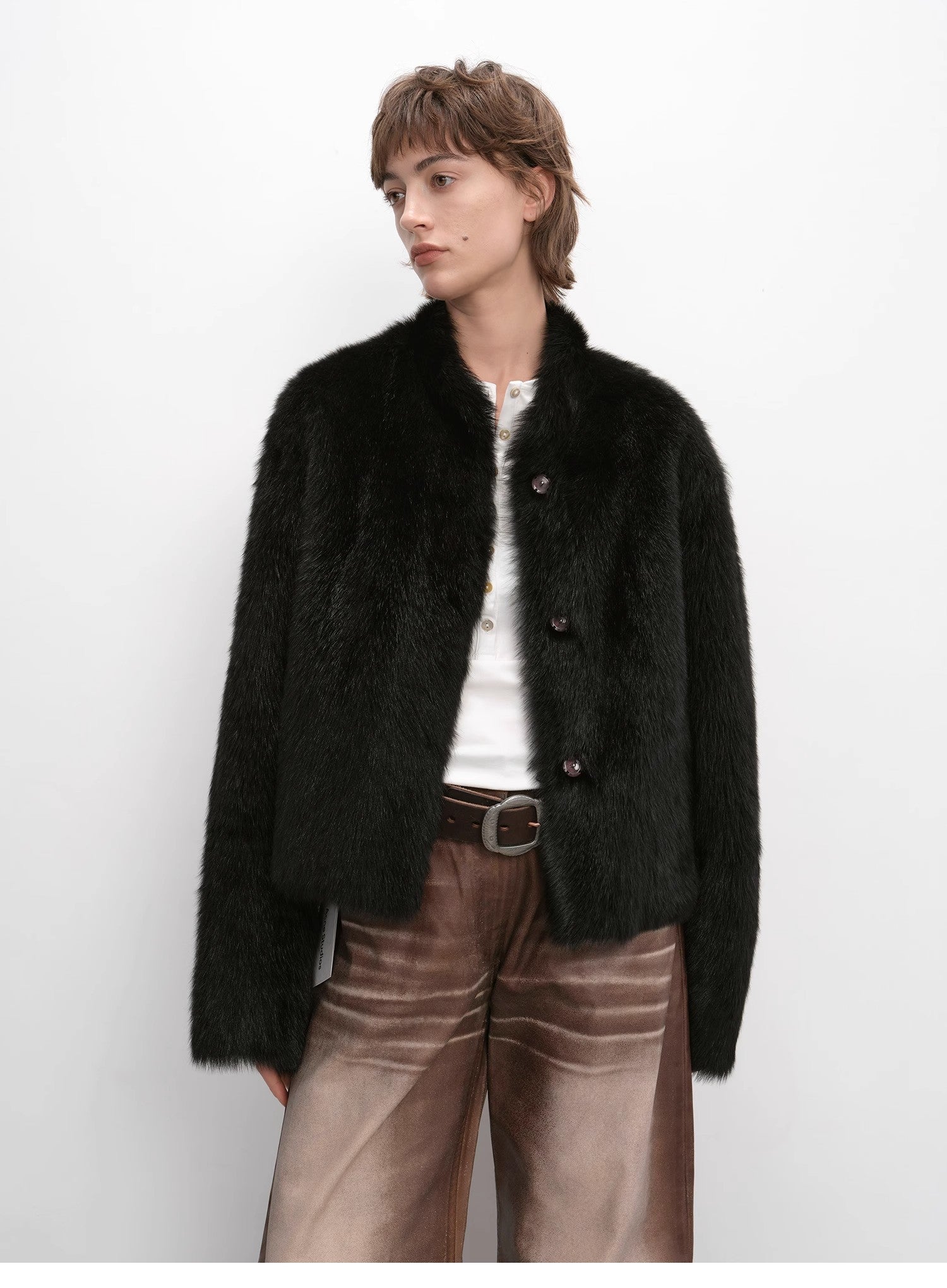 Selected original ecological Toscana fur leather from Italy, with delicate and smooth straight fur surface, warm and not bulky. Advanced custom color system, no mistake to choose. Curved stand-up collar fits the neck warmly, short body does not pick height, easy to create a striking look.