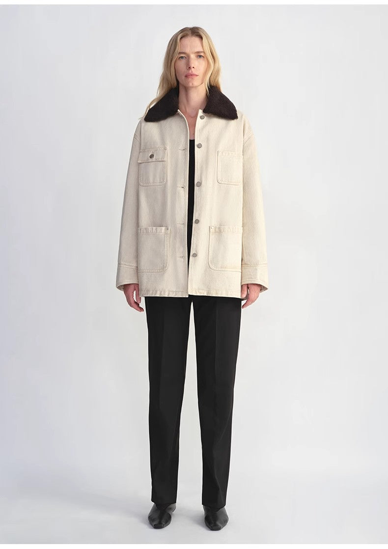 Exclusively customized heavy-washed cotton denim fabric, customized retro-washed color, casual and stylish. Removable contrasting South African merino fur collar, 90% white goose down filling lining, retro, warm, and practical. Classic Detroit jacket cut, showing retro and casual fashion style.