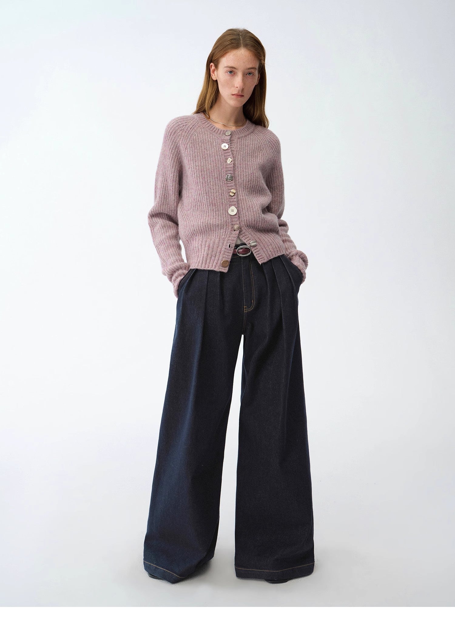 - The cardigan is constructed with pit-pattern knitwork, forming a dense yet flexible structure that holds its shape over time and resists deformation.