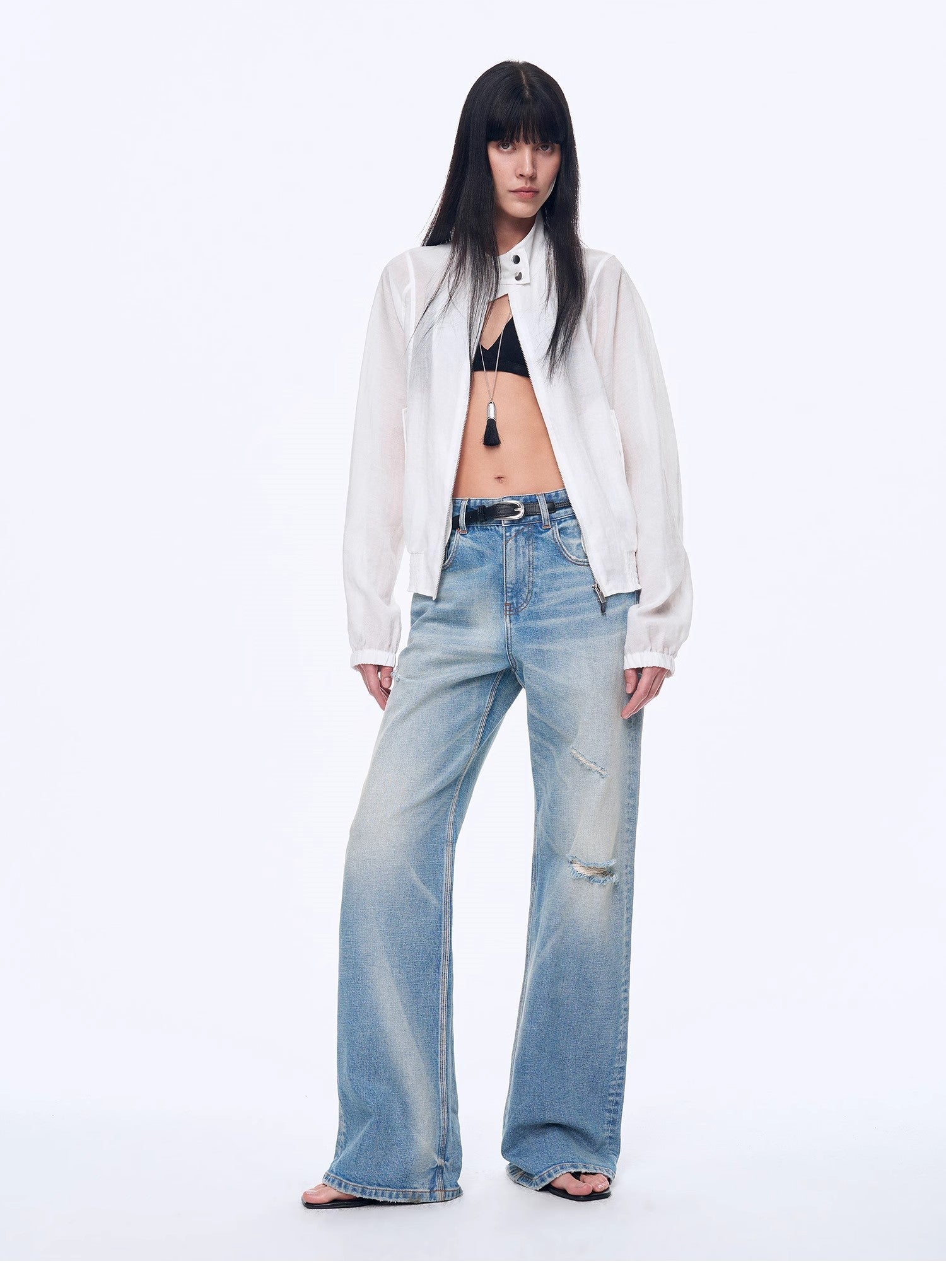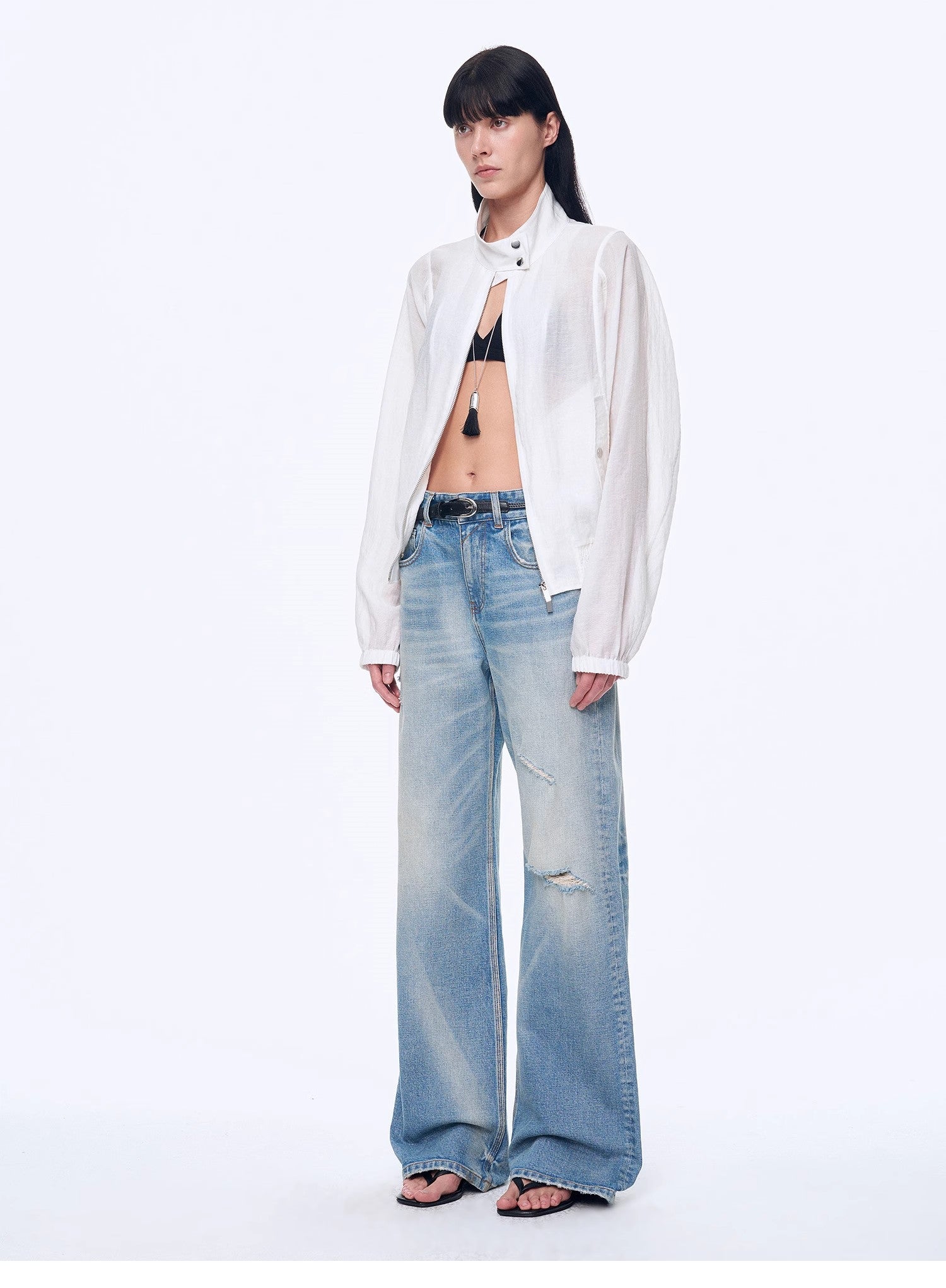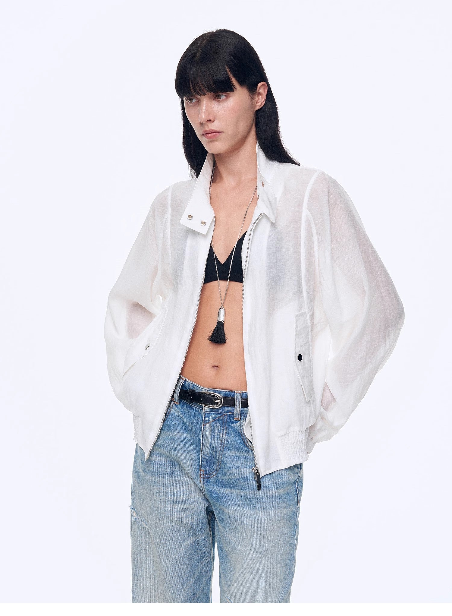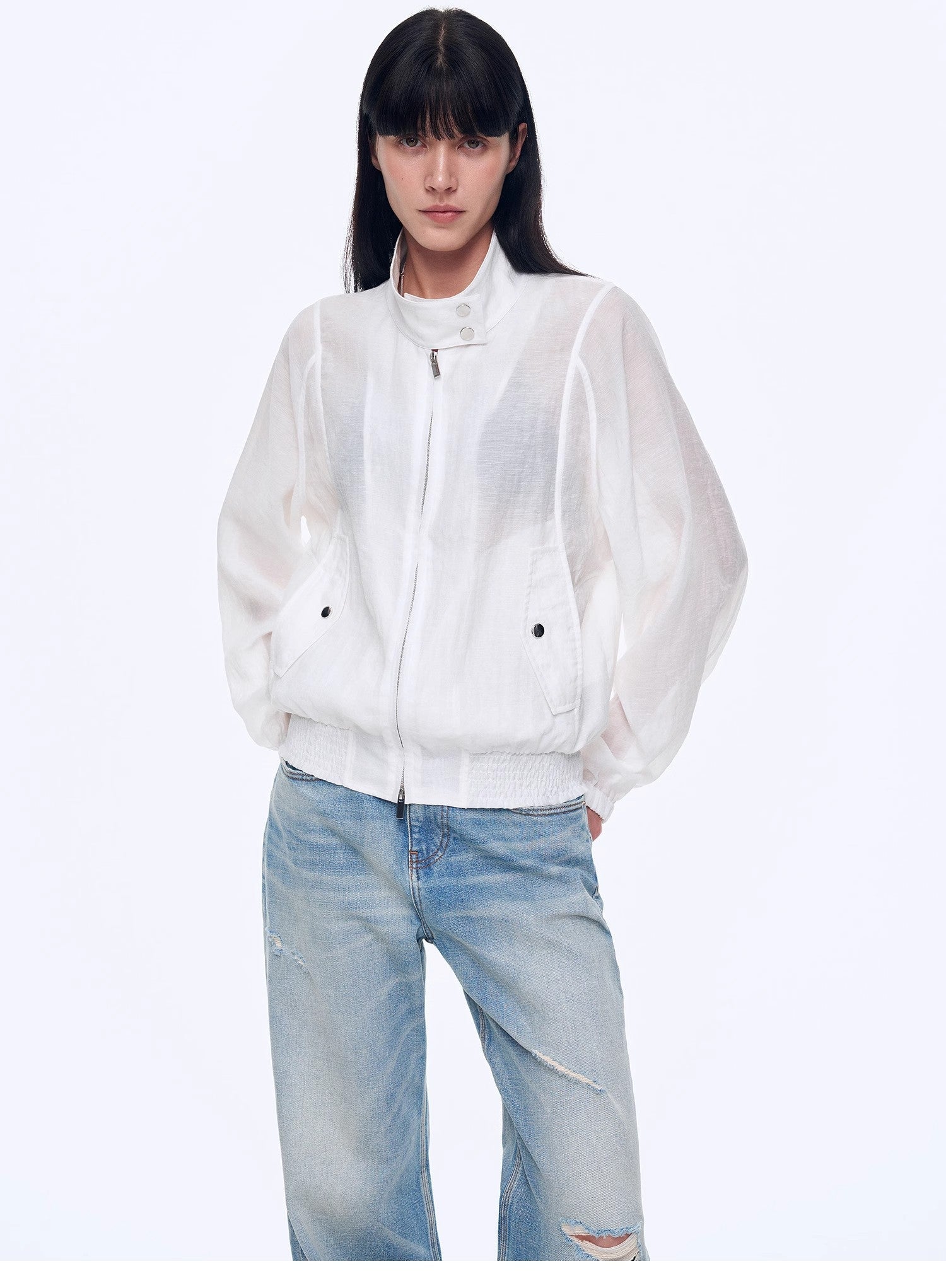 Crafted from lightweight, transparent recycled fiber fabric, this garment is made from fibers derived from natural cellulose, undergoing chemical treatment and regeneration for sustainability. The blend, enriched with nylon and linen, adds structure and durability to the fabric while maintaining its breathability and moisture-absorbing properties. The lightweight nature ensures comfort without feeling heavy or stuffy, with just a hint of transparency to enhance the breathable, airy feel. This fabric not only offers a refreshing touch but also provides a fashionable, eco-conscious appeal.