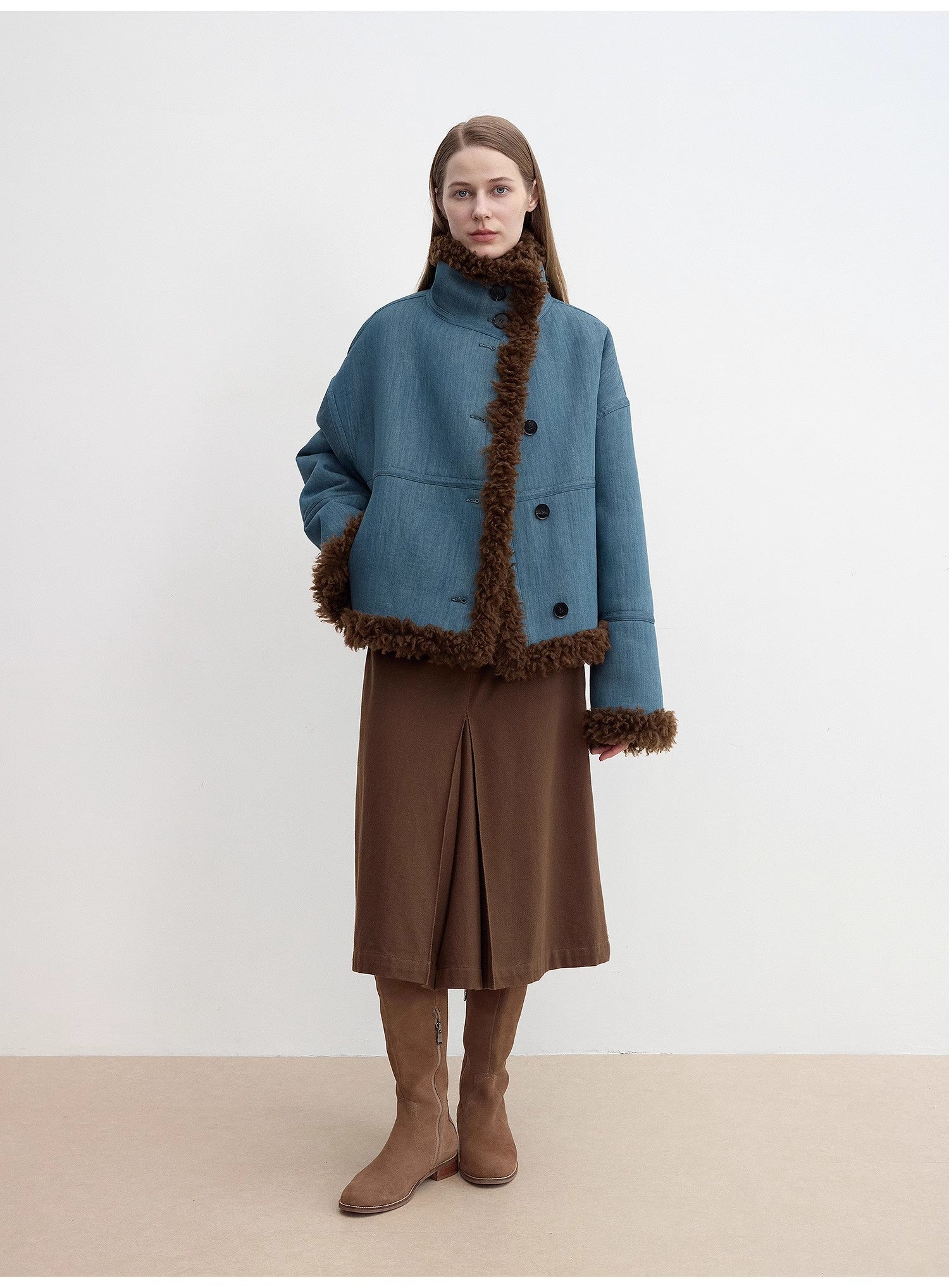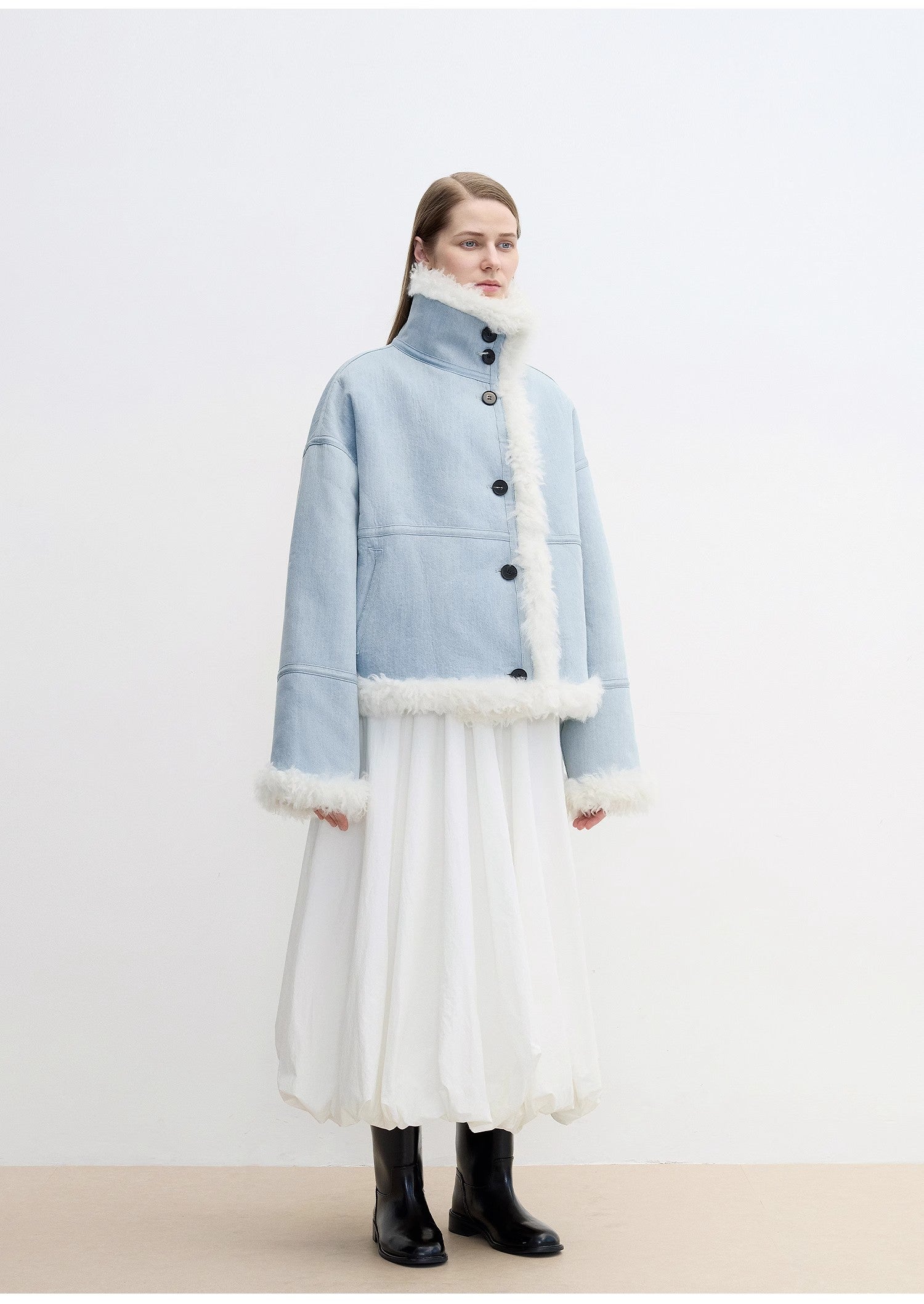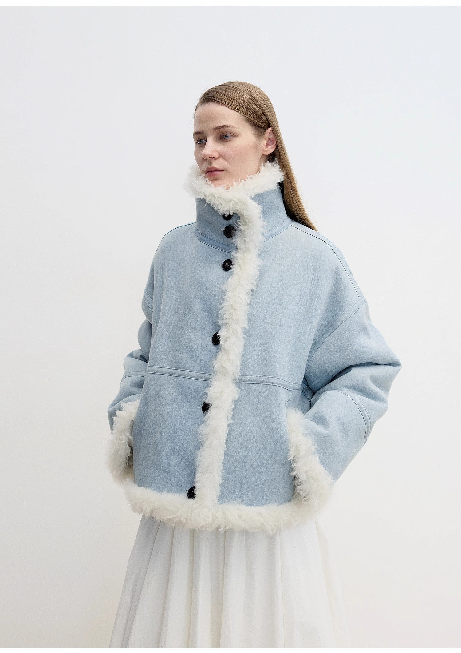 "Mint Glacier"Flip Collar Reversible Shearling Denim Wool Jacket