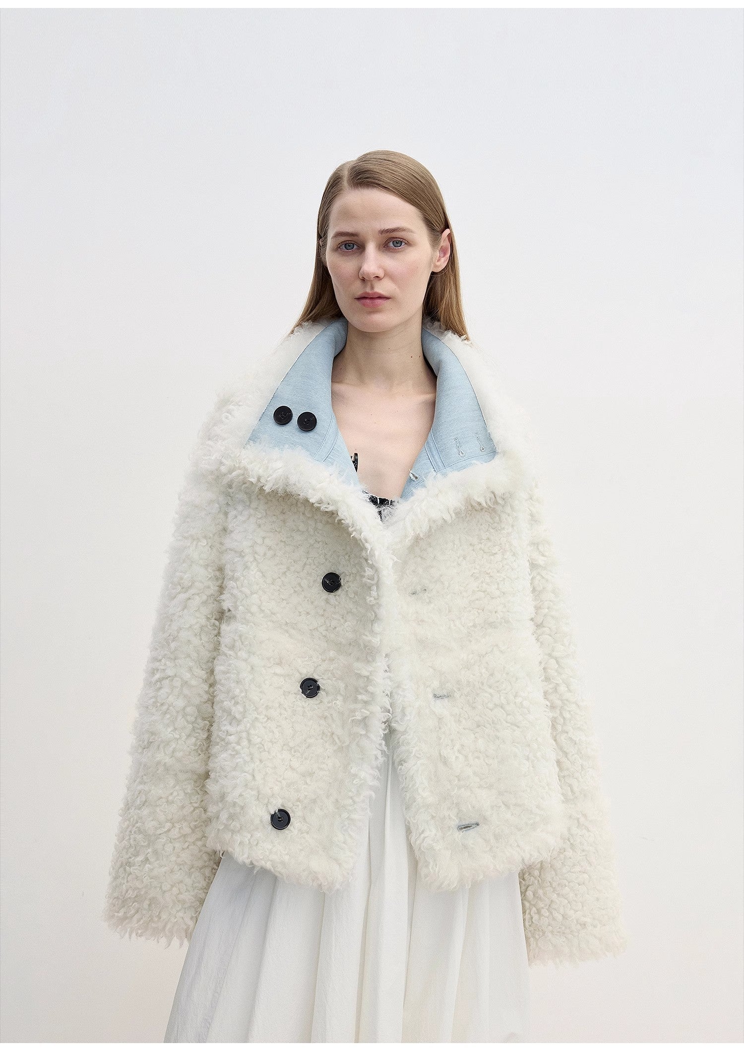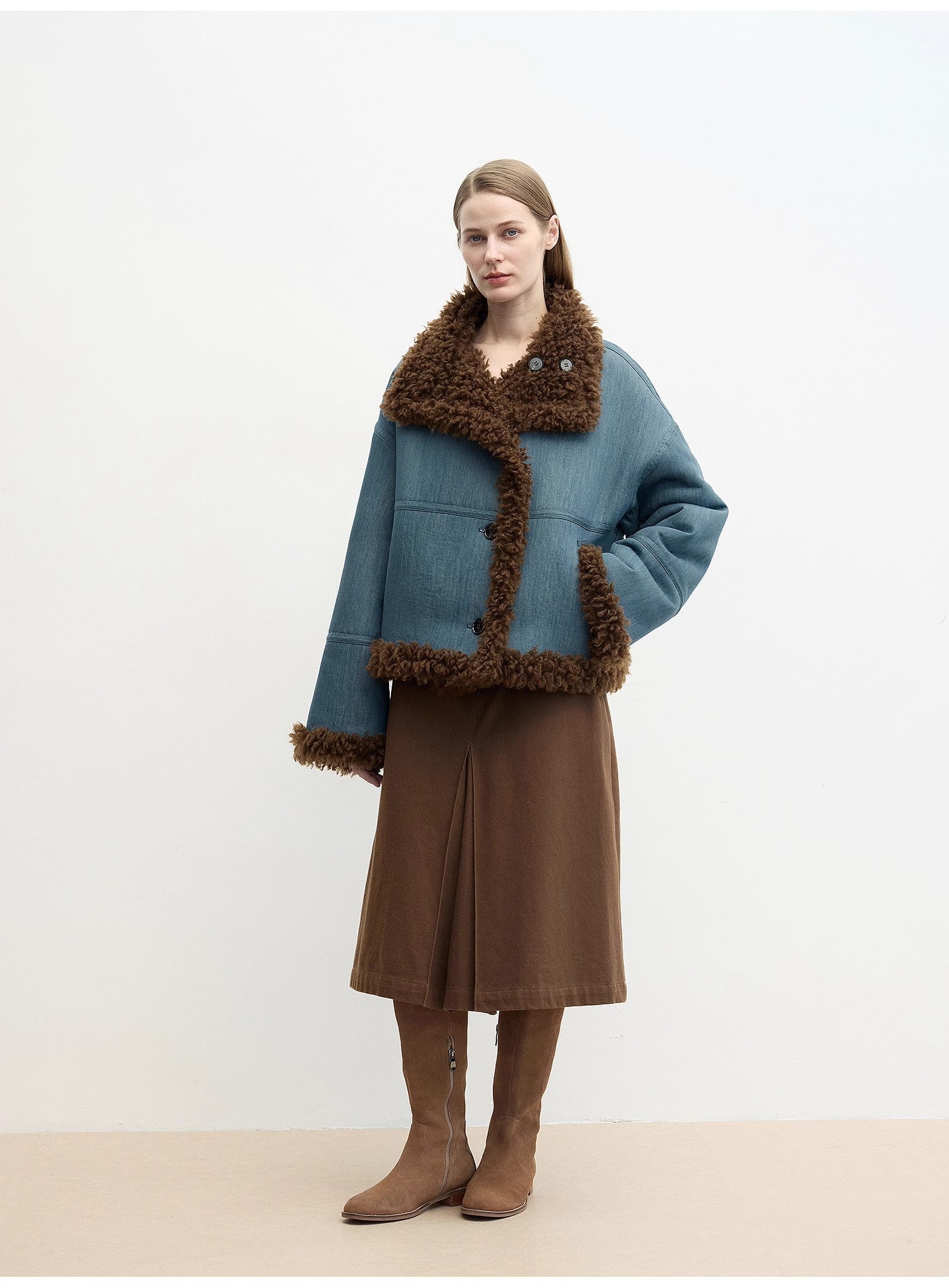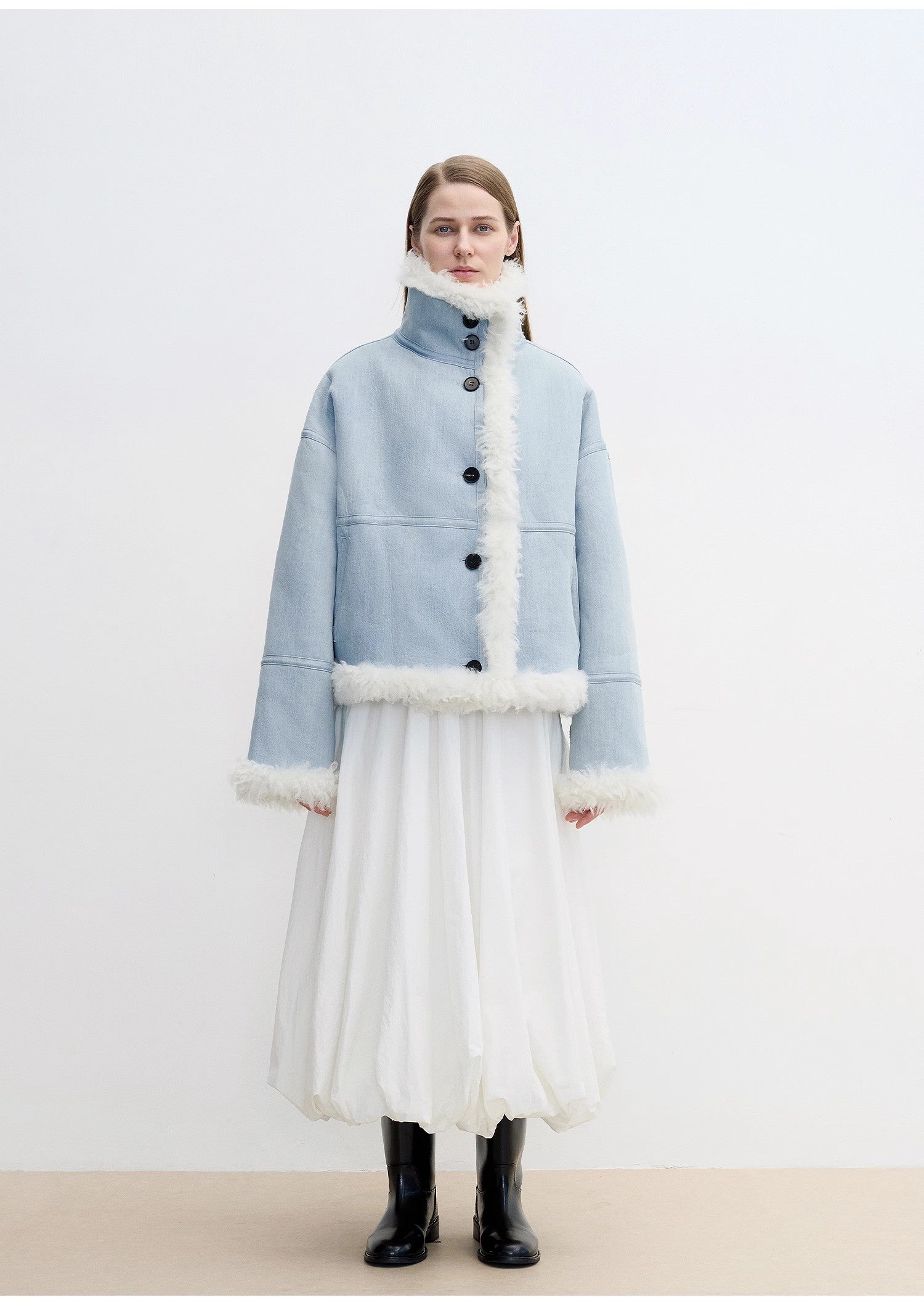 "Mint Glacier"Flip Collar Reversible Shearling Denim Wool Jacket