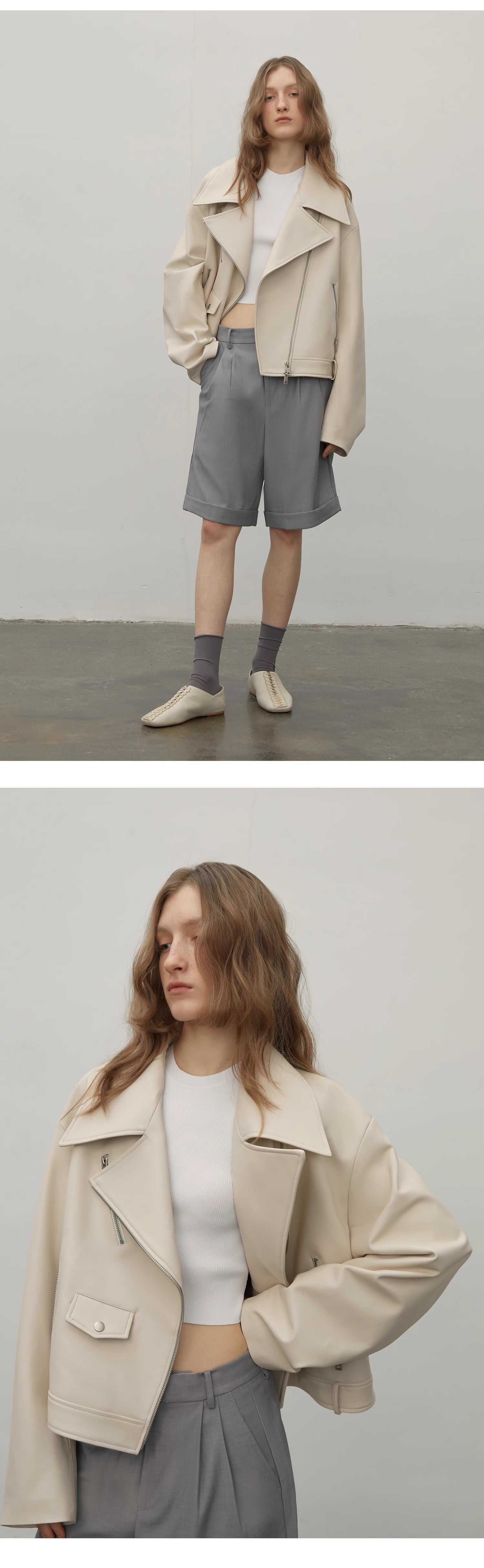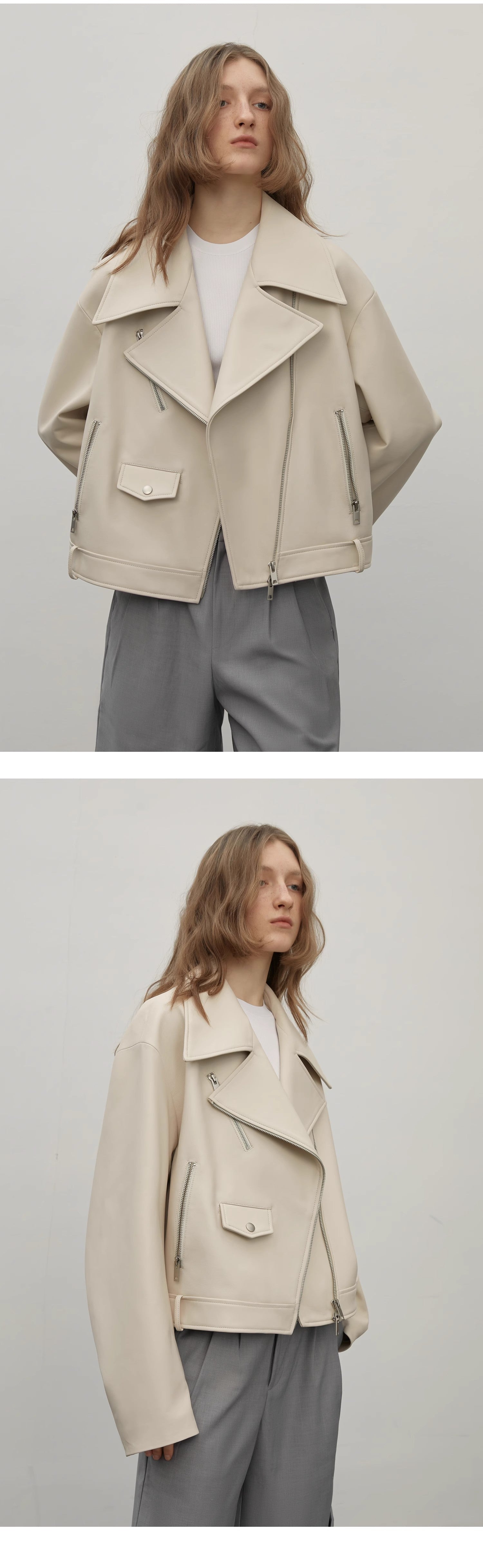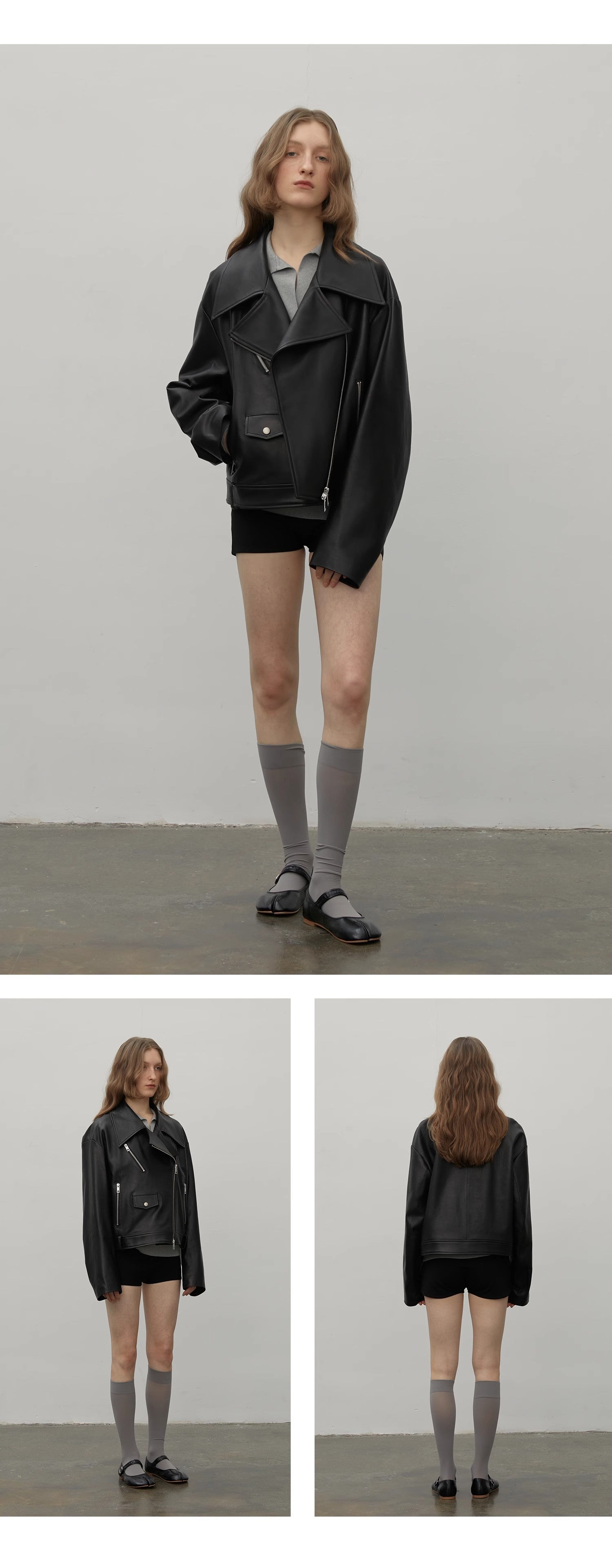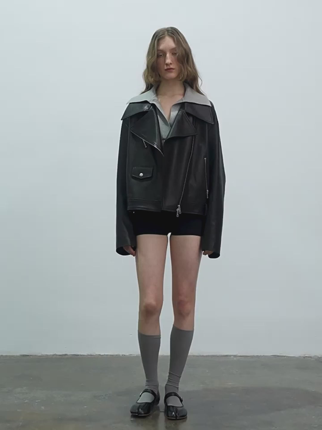 A bold reinterpretation of retro motorcycle styling, this high-street-inspired leather jacket features a straight, loose-fit silhouette with dropped shoulders that create effortless structure and laid-back sophistication. The supple leather drapes naturally, enhancing the body’s shape while maintaining an easy, unrestrictive fit. A sharp, oversized collar draws attention to the neckline, balancing strength and femininity. With its fusion of rugged attitude and refined tailoring, this piece delivers timeless edge with modern elegance.