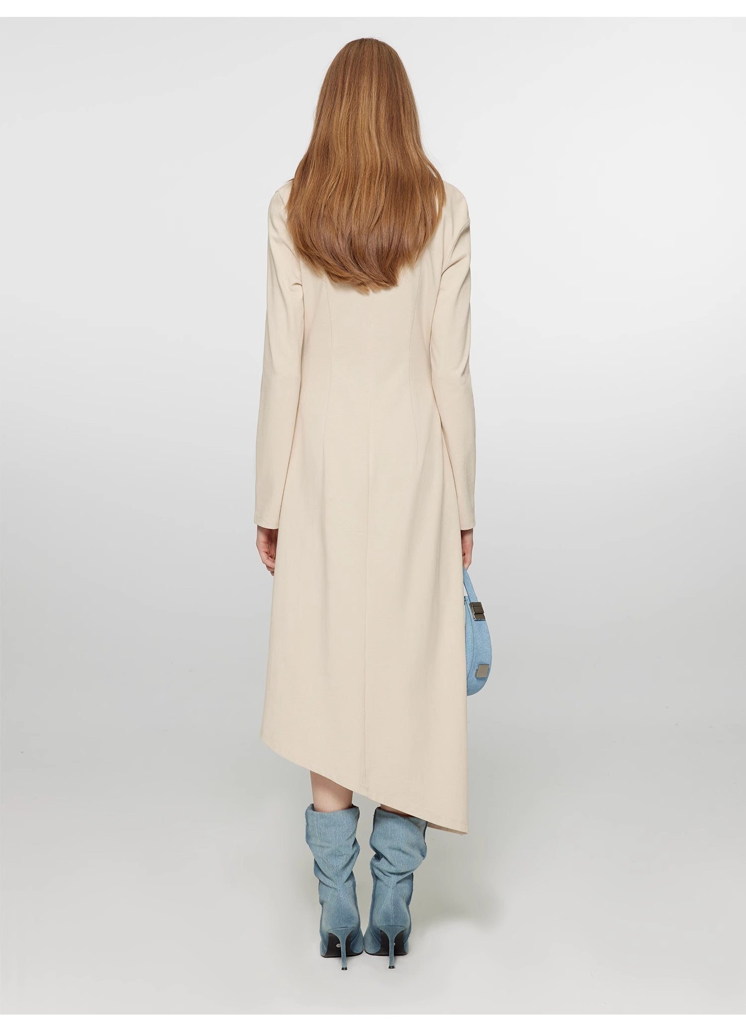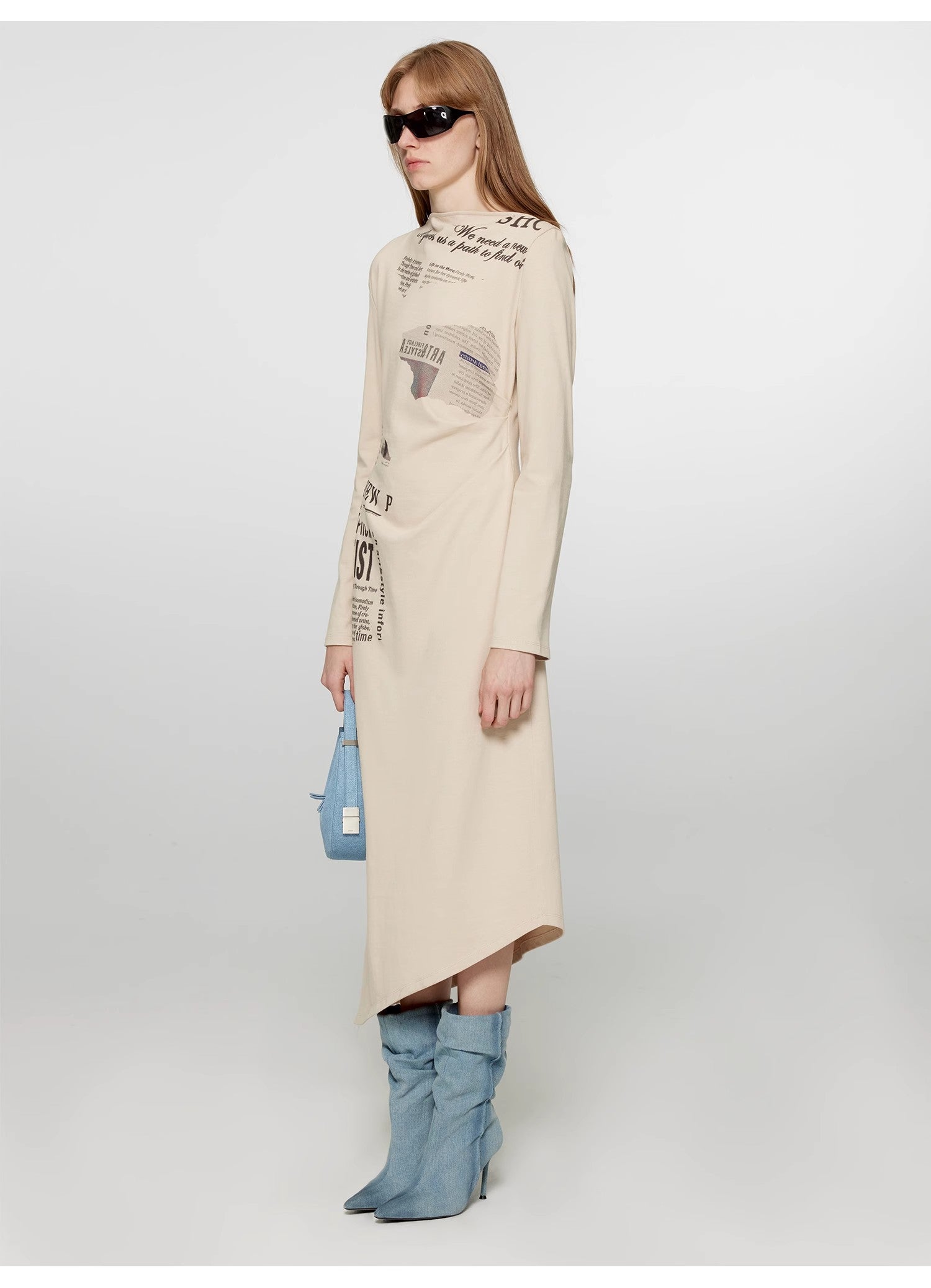 This striking maxi dress features a slightly slanted off-the-shoulder neckline paired with a single-side pleated cinched waist, creating asymmetrical lines that flatter the figure with a streamlined, modern silhouette. The addition of newspaper print elements brings a touch of vintage charm, blending nostalgic appeal with contemporary style. Versatile for both solo wear or layering, this dress offers a chic and fashionable option for any occasion.