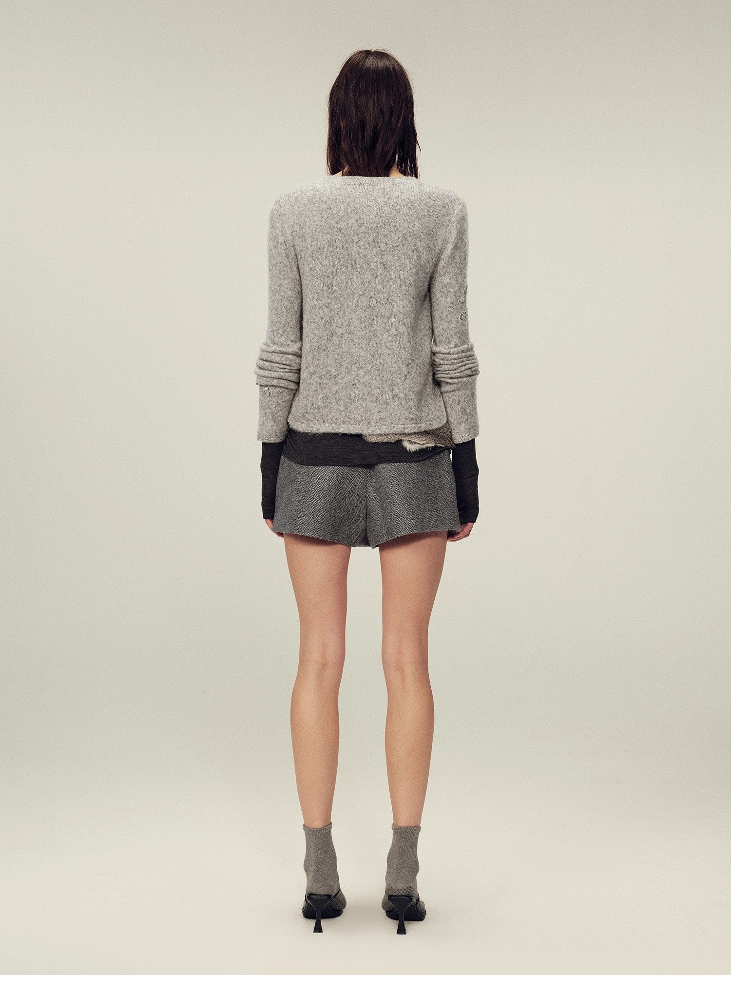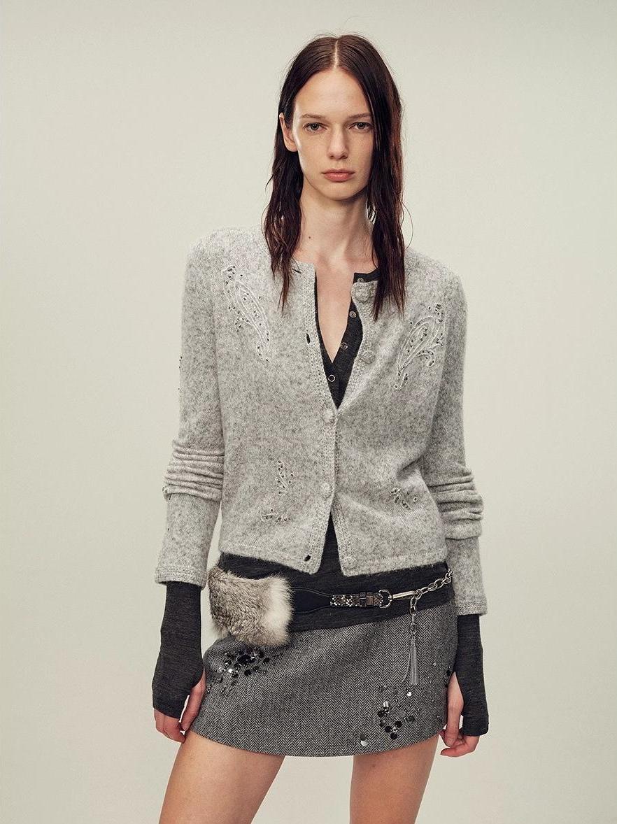 This cardigan is crafted from a blend of fine alpaca and wool, creating a rich, fluffy, and soft feel. Cut for a flattering fit, it's embellished with hand-crocheted paisley sequins for a dynamic and free-flowing pattern.