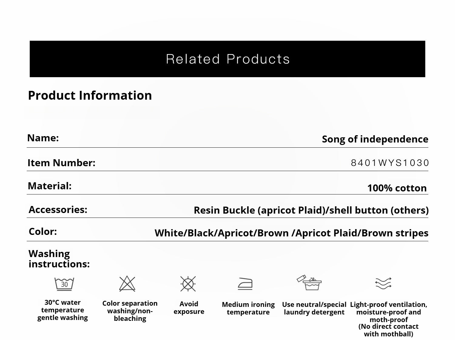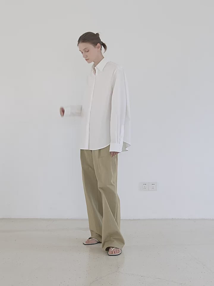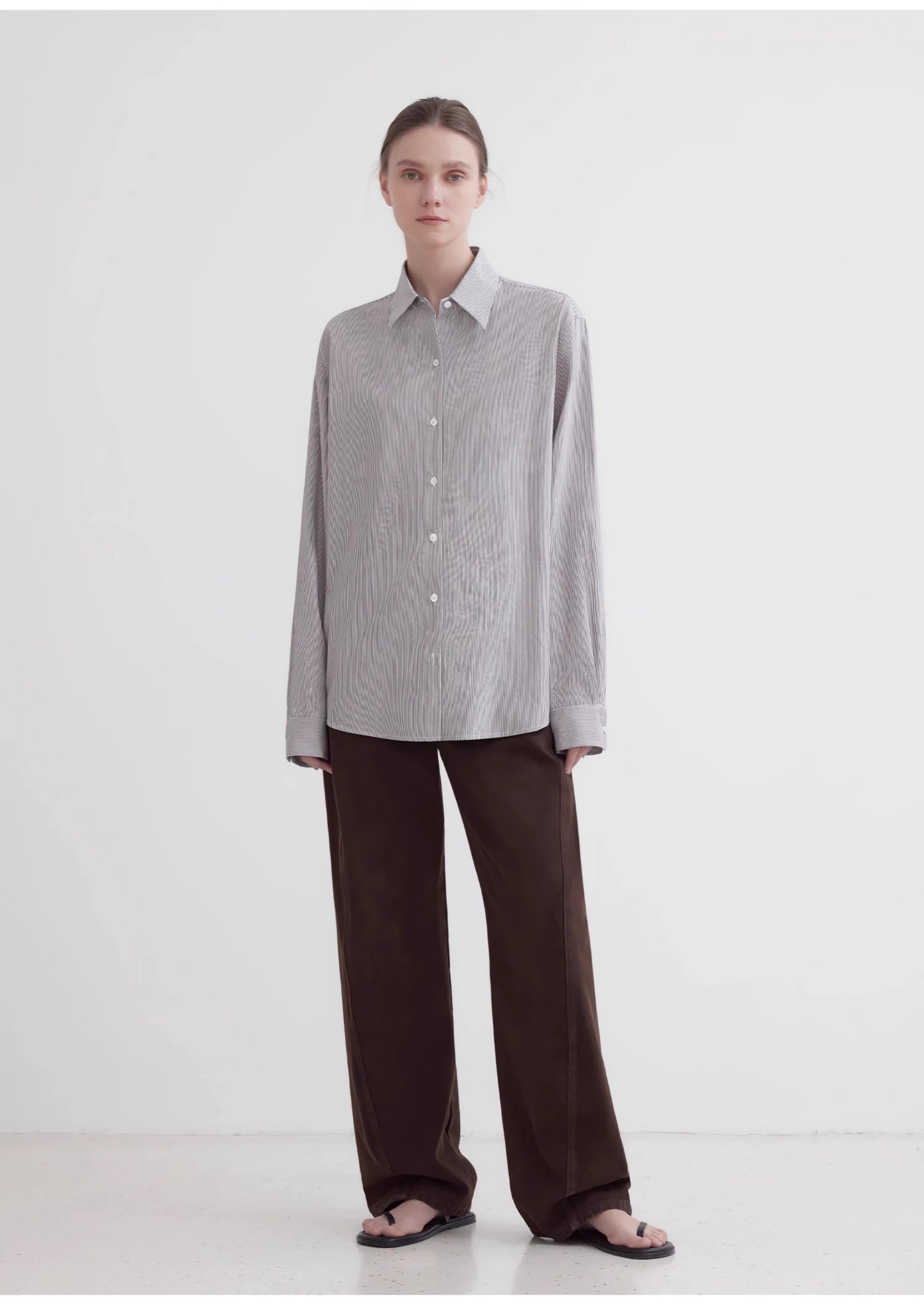 This classic, loose-fitting, straight-leg shirt design offers effortless comfort. The slightly loose silhouette allows for a relaxed, unrestricted fit, creating a comfortable, airy feel. The custom-made tailoring creates a classic lapel shape that flatters the neck without sacrificing comfort. Delicate buttons enhance the look. The straight sleeves create a simple, elegant look, flattering the shoulders and creating a powerful, sculpted silhouette. This design optimizes the head-to-shoulder ratio and emphasizes a chic, urban feel.