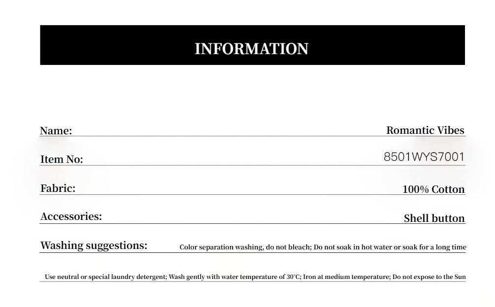 Crafted from premium long-staple cotton, the fabric is soft, breathable, and skin-friendly. Its smooth, slightly brushed texture is enhanced by a delicate fermentation washing process that naturally shrinks the material, creating an elegant, slightly wrinkled appearance. This high-quality cotton maintains its rich, clear colors and resists fading, providing a sophisticated and high-end ready-to-wear look.