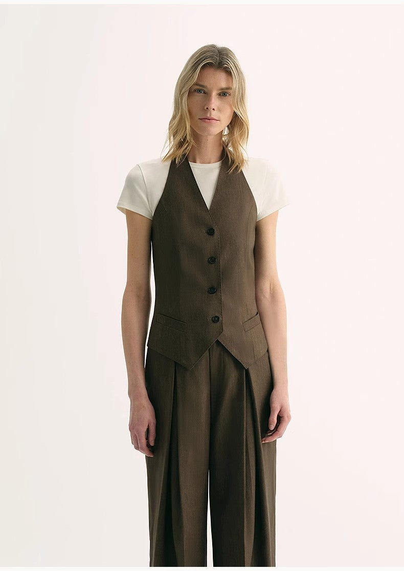 This tailored vest features a fitted straight silhouette that flatters the figure with clean, slimming lines. The cropped length enhances body proportions, visually elongating the legs for a more balanced and elegant shape.