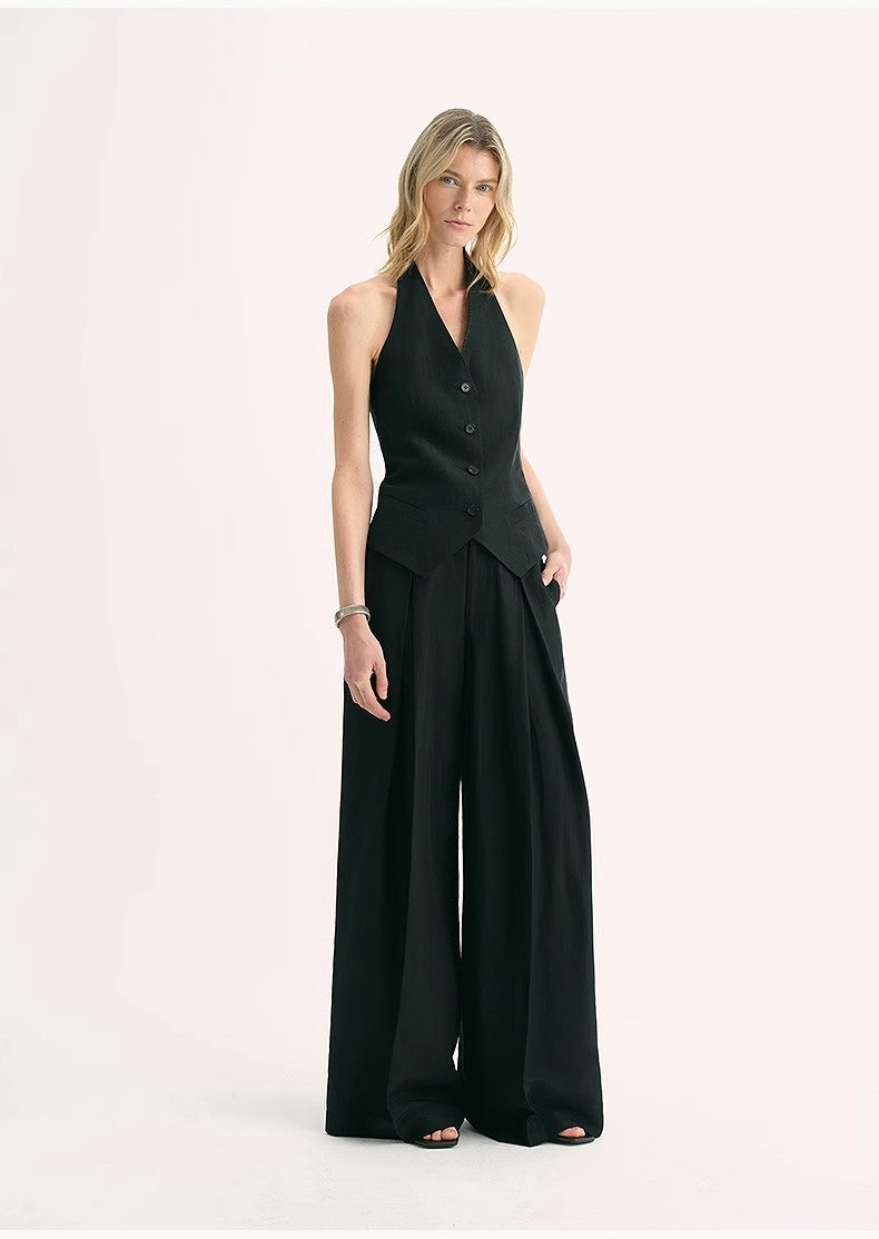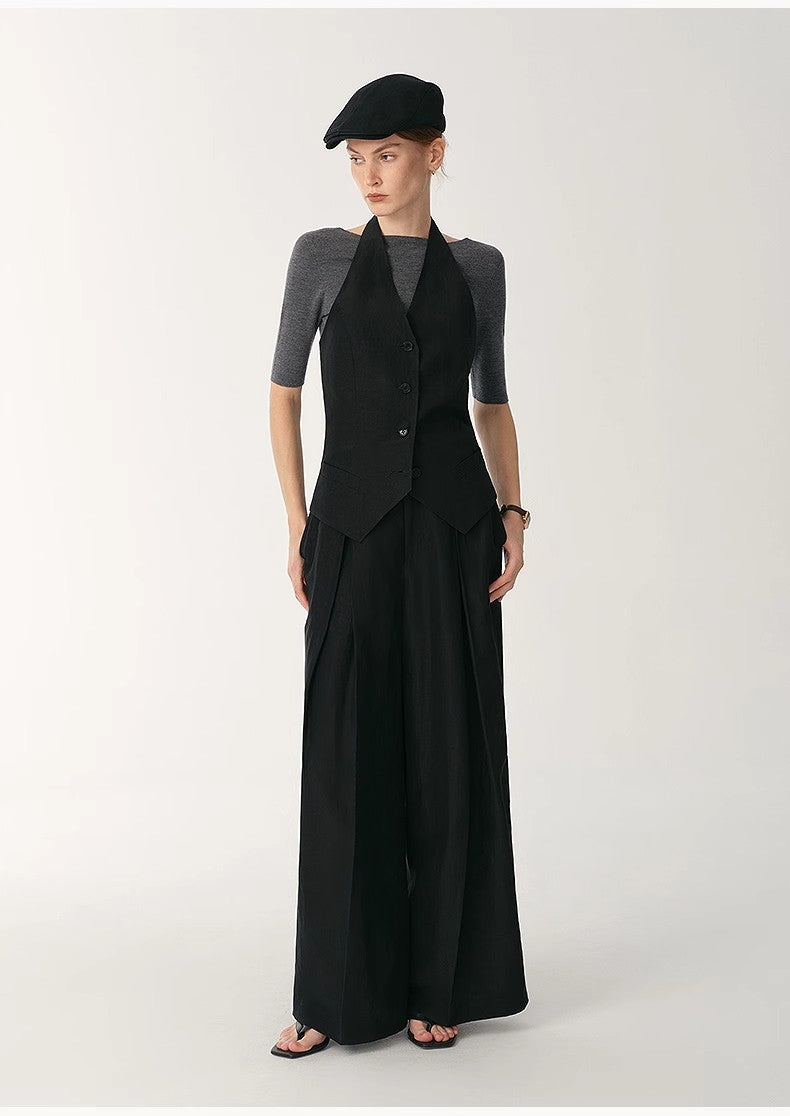 The halter-style neckline accentuates the collarbone and shoulders, while the deep V-neckline frames the face for a modern, structured look. Adjustable armholes offer a customizable fit that flatters the upper body while discreetly covering side busts. Sleek, versatile, and effortlessly chic, this piece transitions seamlessly from elevated daywear to sophisticated evening styling.
