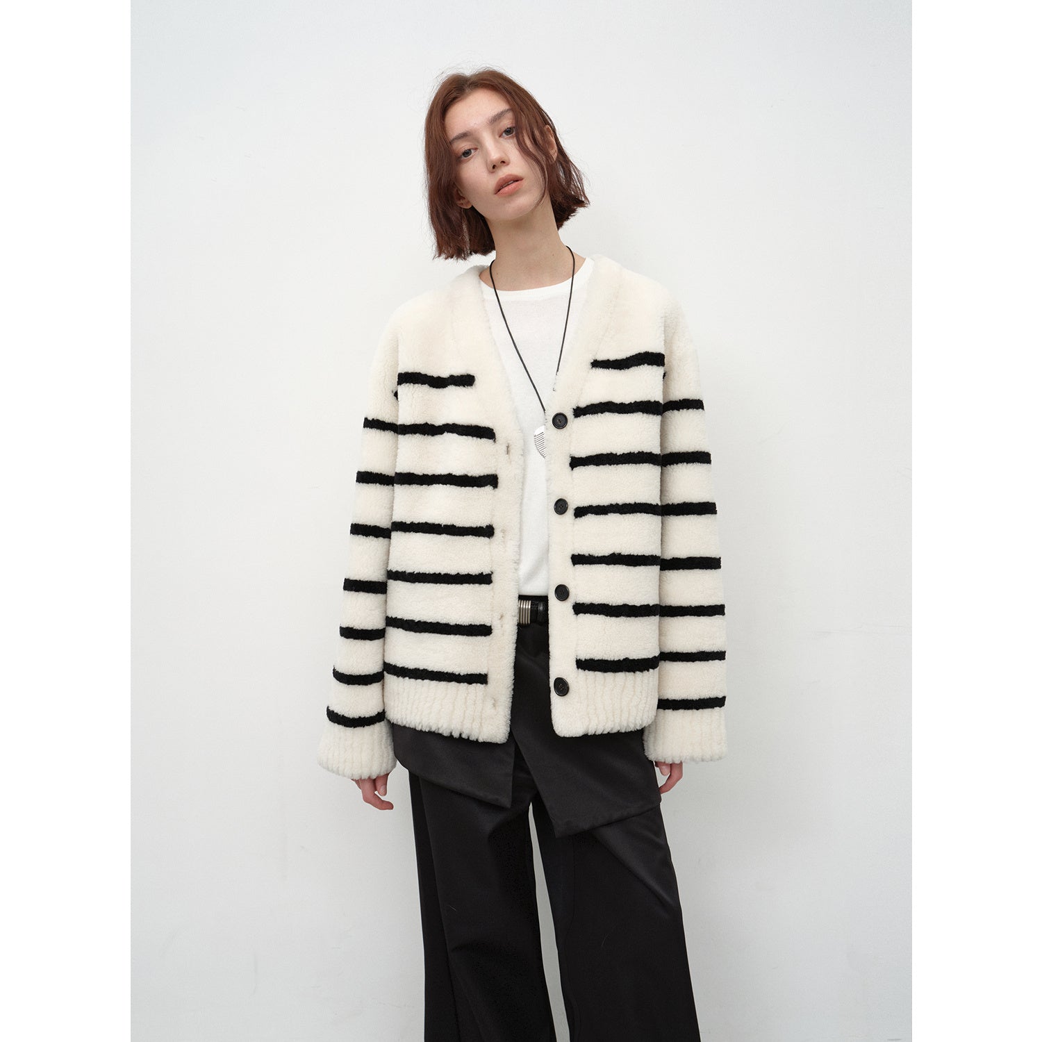 It is made of imported Spanish merino sheepskin and high-end two-color wool splicing technology to create a classic striped pattern, breaking the monotony of solid colors and the dull atmosphere of autumn and winter.