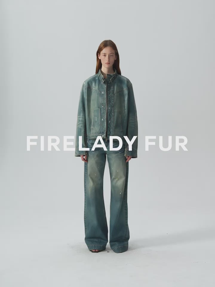 "Welsh" Original Leather Coating Process Distressed Motorcycle Style Stand Collar Short Denim Jacket